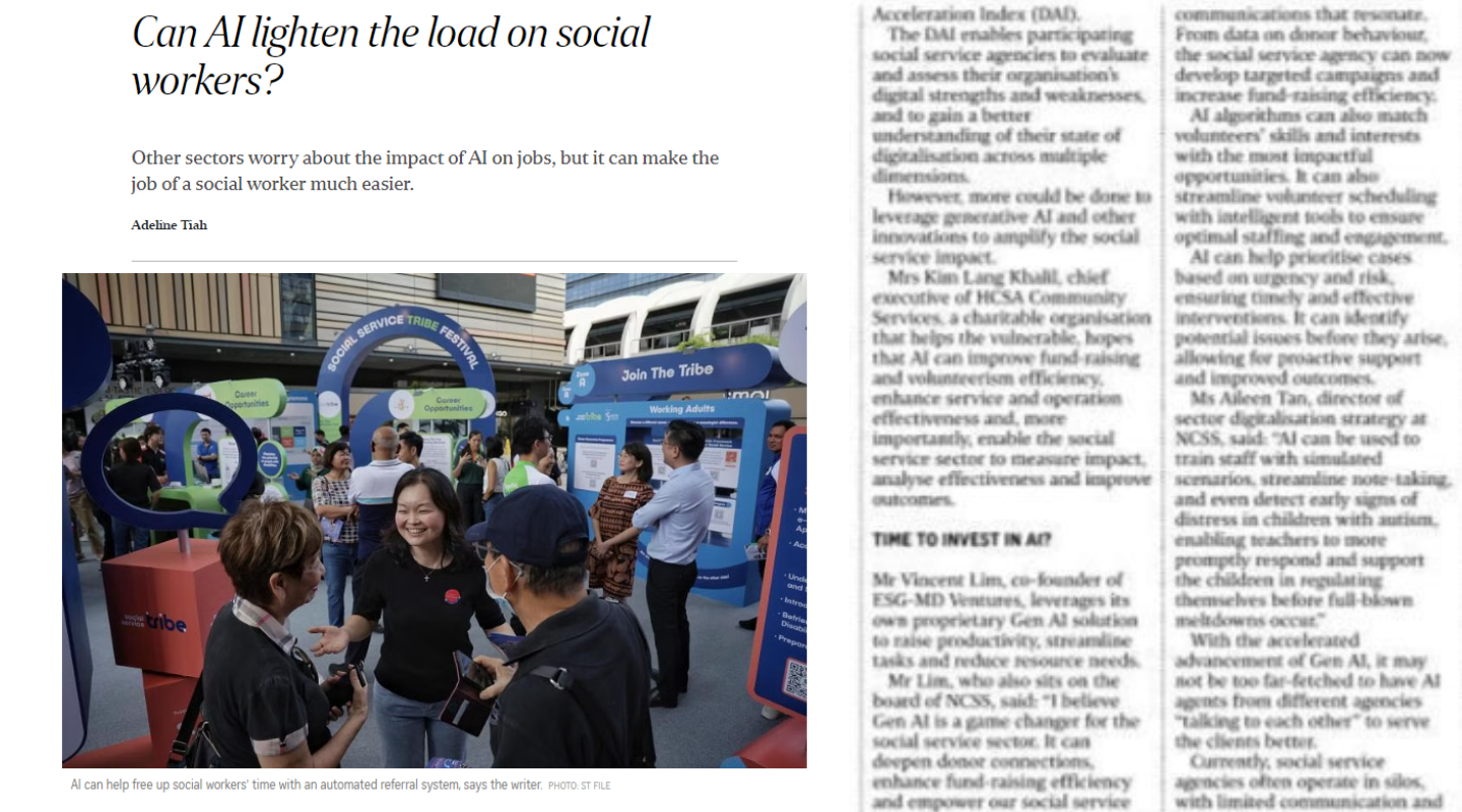 In a Straits Times op-ed, Our CEO Kim Lang Khalil shares her hopes that AI can improve fund-raising and volunteerism efficiency, enhance service and operation effectiveness and, more importantly, enable the social service sector to measure impact, analyse effectiveness and improve outcomes.
